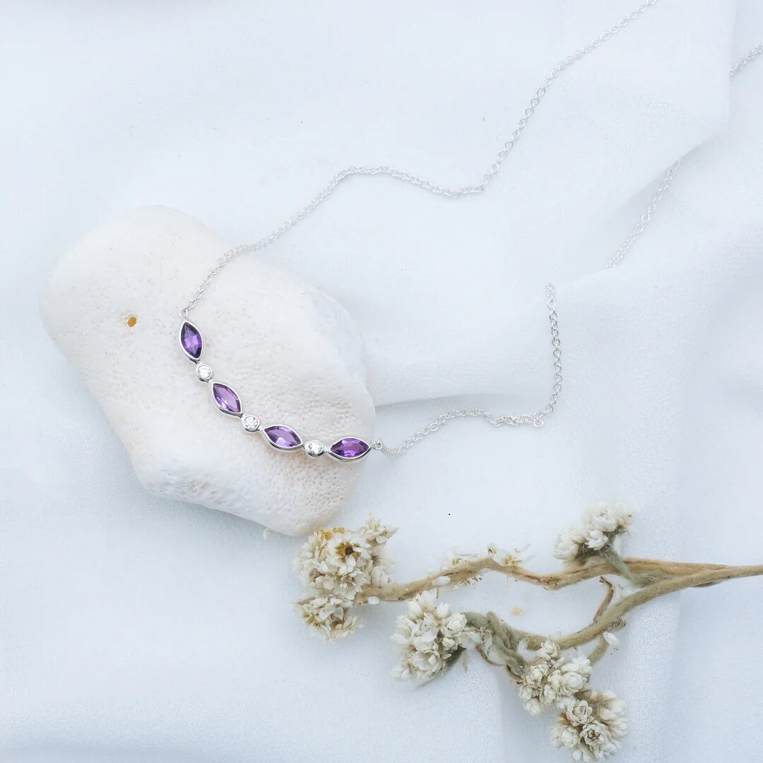 The Enchanted Collection is a collection from Sunaka Jewelry that is inspired by women's elegance and courage. The 18 karat gold plated/ Silver Antitarnish is represented of elegance with the Garnet, Amethyst, and Blue Topaz stone.